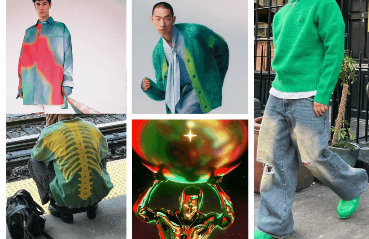 For menswear this color invites to explore the intersection of humanity and technology. A digital real aesthetic is driving tech-inspired combinations and nostalgic futurism. This color is becoming an active and laud neutral for menswear with brands like Acne Studios making of Mystic Green their “basic” color for menswear.
