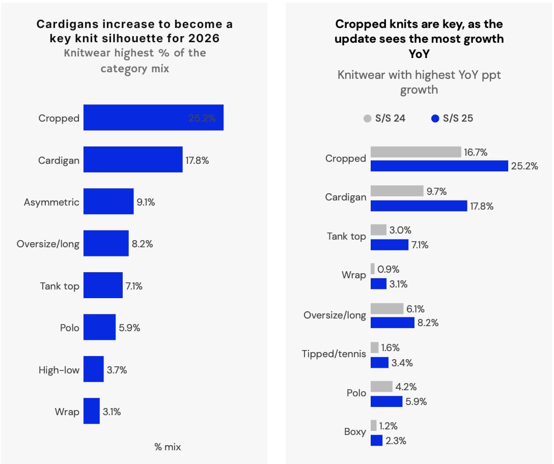From a client perspective, there is a clear winner across categories in 2026: the cardigan, in all its cropped reinterpretations. From Acne Studios to Miu Miu, from Urban Outfitters to Marni, year-on-year data suggests this category will remain commercially strong. It delivers on layering, transseasonality, and, let’s be honest…it adds a sense of cool.