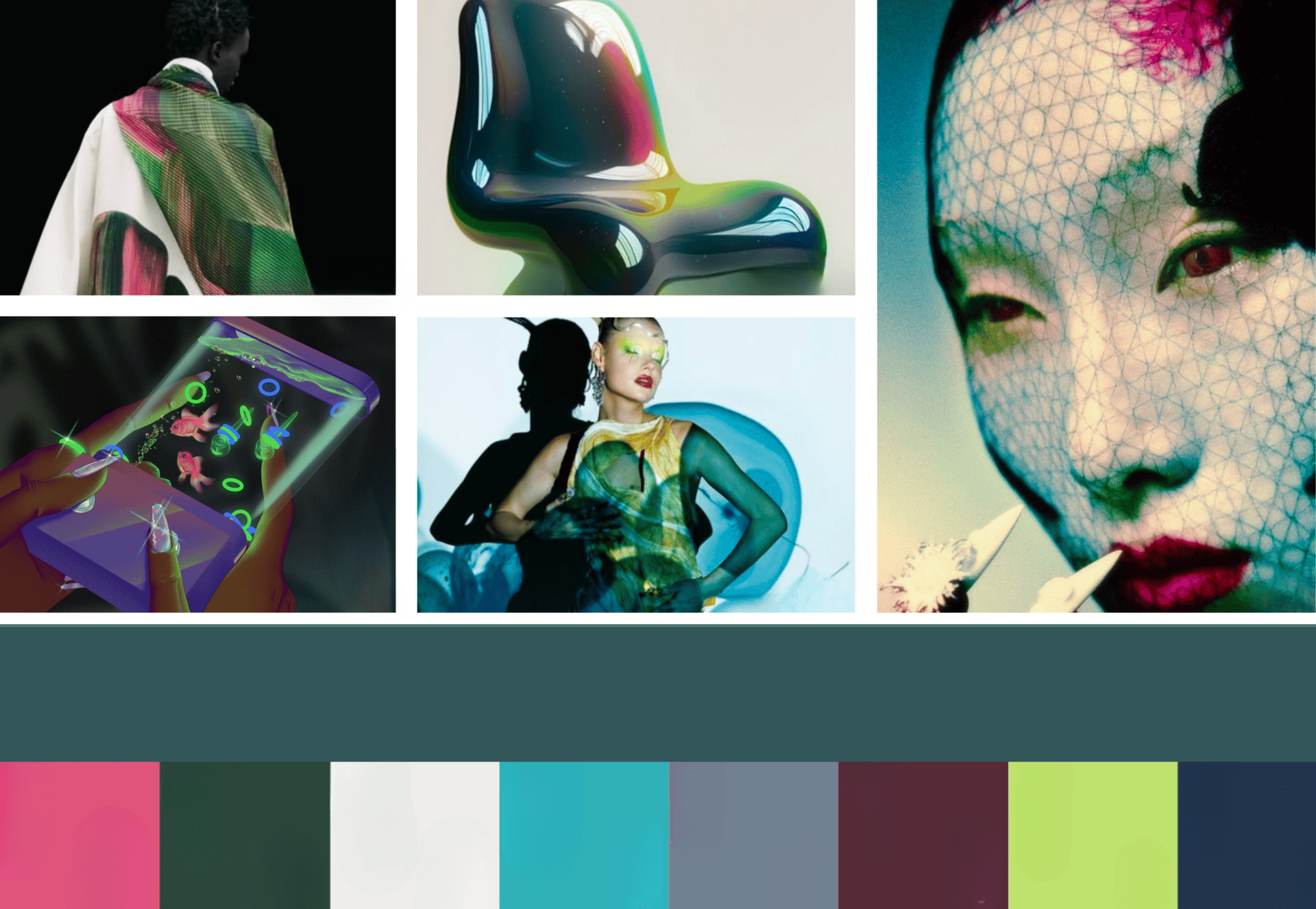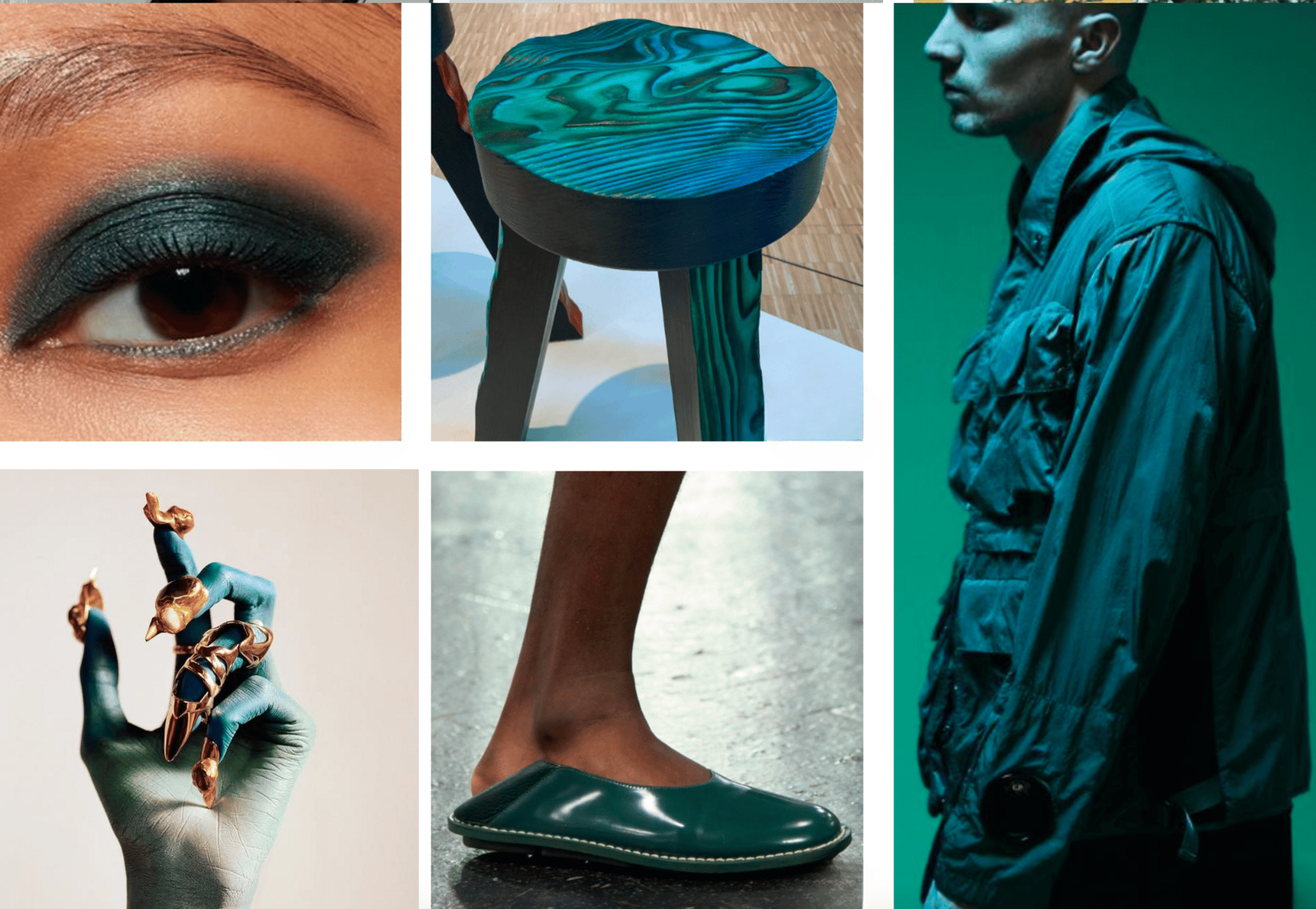 A gender-inclusive, transseasonal shade, Transformative Teal color moves easily from utility to occasion wear. It elevates outerwear, active, and footwear through glossy, high-shine finishes. While in interiors it becomes mysterious and mesmerizing with iridescent, anodized, or fictionalized effects.In beauty it brings depth to makeup, nails, hair, and packaging with its moody, atmospheric quality.