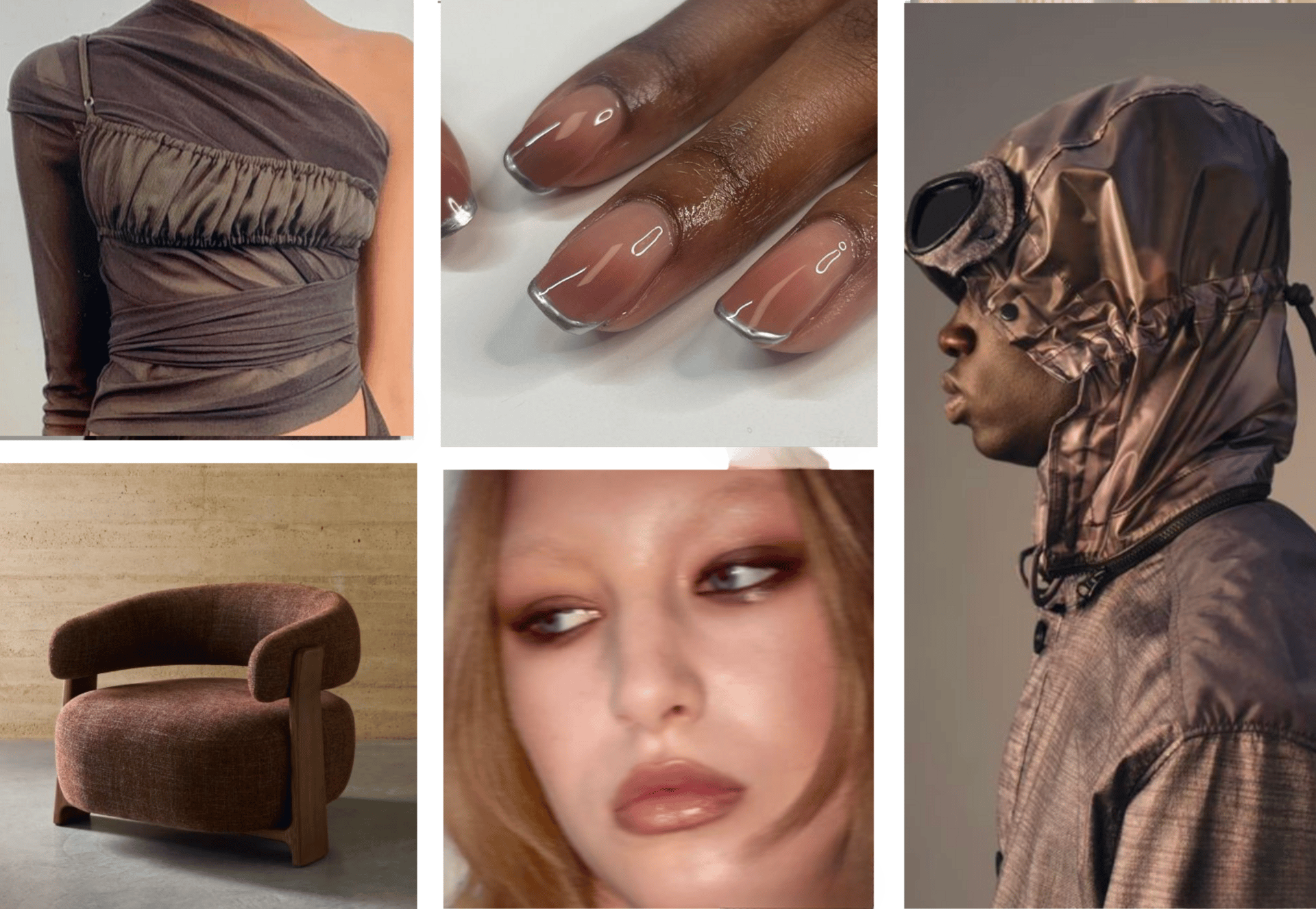 Earthy yet elegant, Cocoa Powder is the season’s key dark with true transseasonal appeal. Versatile across menswear, womenswear, footwear, and accessories, it harmonises with restorative darks while elevating outerwear and active pieces through luxe finishes. Beyond fashion, this shade premiumises interiors, tech, and sports with metallic treatments, while in beauty it translates into frosted packaging and velvet-matte textures.