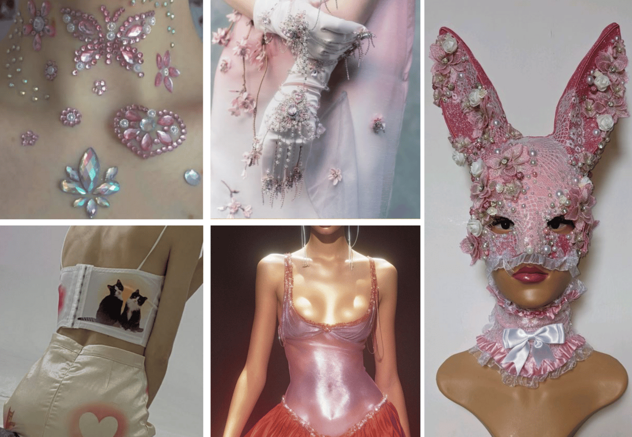 This trend serves up a naive, almost dadaist fantasy — where ruffles meet rubber duckies and nothing makes perfect sense (on purpose). Its cosplay meets couture in a swirl of hyper-textures, oddly-placed prints, and pastel chaos. Think frosting-colored lingerie, plush details, sheer layers with bows, masks that belong at a carnival, and a wink to childhood nostalgia… but reimagined for grown-up play. It’s weird, whimsical, and utterly wearable — if you dare.