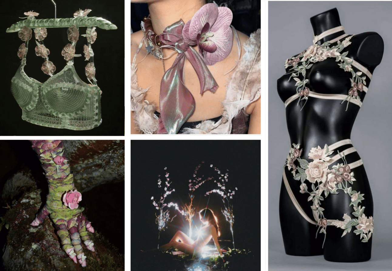 This theme blends vintage romance, futuristic detailing, and fairytale mystique into one hauntingly beautiful story. Picture delicate lingerie adorned with 3D floral appliqués, sheer veils, and soft corsetry — but then twist it with hints of fetish: leather vines, bondage-inspired ribbons, or PVC petals.