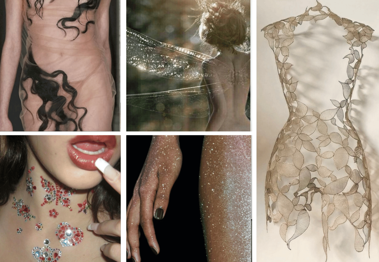 Besides lightweight fabrics, this direction includes makeup/painted underwear and stickers to cover body parts. Poetic, subtle and revealing.